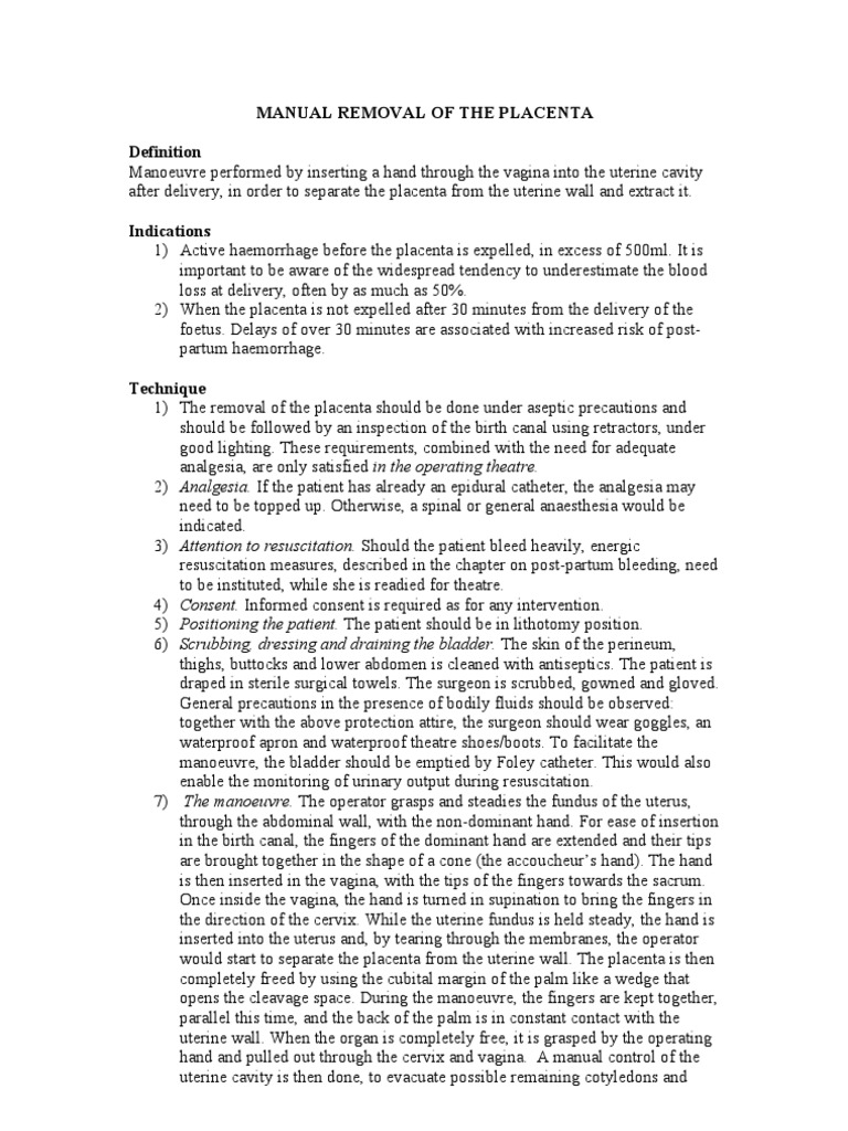 Procedures for manual removal of the placenta and membranes indications for use of manual removal procedures the decision to attempt manual removal of the placenta and membranes in an otherwise normal labor and birth should be based on one of two indications. The placenta is stripped from the uterine muscle gently. Give pethidine and diazapam iv slowly or use ketamine. Manual removal of a retained placenta october 2018 page 2 of 3.